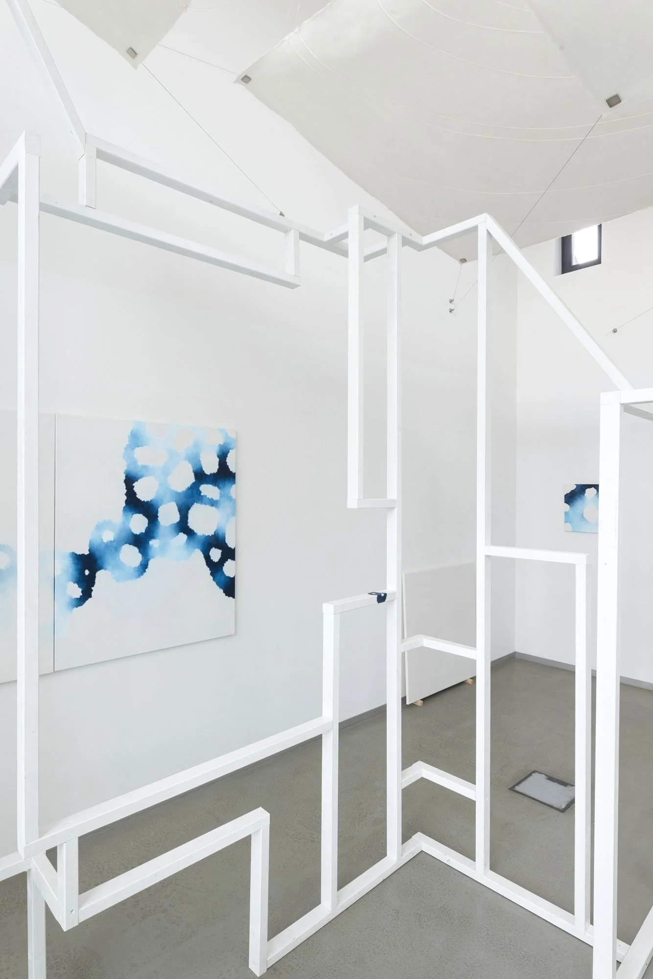 In der Ausstellungssituation im Galerieraum interagieren die malerischen Elemente von Rio Usui mit der architektonischen Konstruktion von Till Röttjer. Die beiden Werke wurden für sich stehend entwickelt und im folgenden Arbeitsprozess zusammen gedacht, stehen sich nicht gegenüber, sondern bilden gemeinsam etwas Neues. So finden sich auch auf der in weiß gehaltenen Holzkonstruktion ‚Ableger‘. Die Malerei Rio Usuis verlässt den Bildraum der Leinwand, um als fluider, fragmentarischer und lebendig-ganzheitlicher Organismus den gesamten Raum zu erfüllen, und das nicht nur auf visueller Ebene, sondern auch gedanklich-imaginativ. Aus Fragmenten wird ein Ganzes, in das einzutauchen neue Perspektiven schafft.